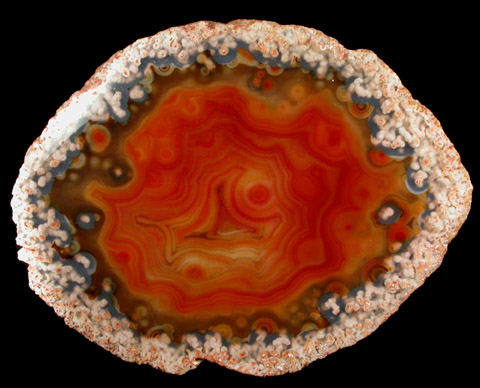 | Description: | Thin slab sliced from a quartz agate nodule (quartz, variety chalcedony) with red-to-orange fortification zone in the center, surrounded by transparent rim that has pale-gray spherulite rosettes in the outermost edges. |
