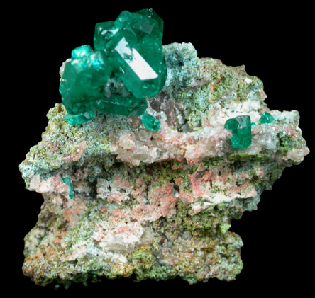 | Description: | Lustrous emerald-green transparent dioptase crystals to 9 mm long on calcite-rich matrix with olive-green duftite microcrystals. Ex. Robert P. Bates (1926-2008) collection #681 |
