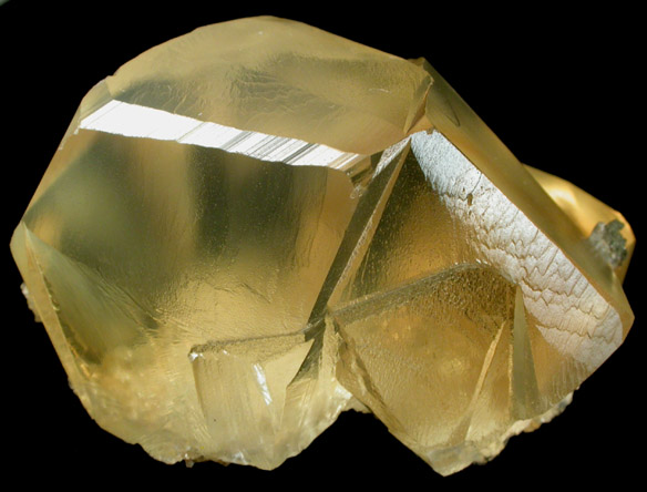 | Description: | Transparent (internally flawless!) yellow rhombohedral calcite crystals penetration-twinned three places on the {00·1} planes with minor matrix attached on the bottom and one corner. Each calcite crystal is twinned to the adjacent calcite crystal. Ex. Robert C. Lambert (1919-2008) #135; acquired in 1994 |
