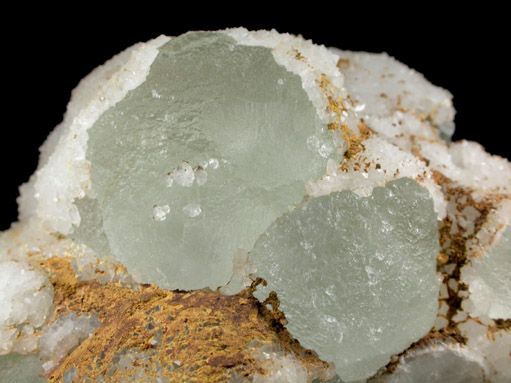 | Description: | Spherical crystals of transparent green fluorite to 32 mm across with surfaces composed of many smaller parallel crystal faces. The fluorite grew over milky quartz core and many areas have 1 mm crust of limonite-stained quartz crystals over the fluorite. |