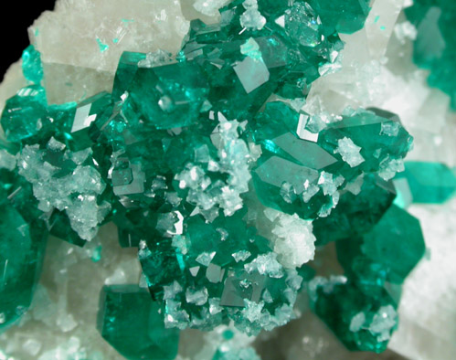 | Description: | Sparkling emerald-green transparent dioptase crystals up to 6 mm long on colorless translucent rhombohedral calcite crystals to 5 mm across with a later generation of transparent colorless calcite crystals up to 1 mm on the dioptase crystals. Ex. Bob Holzer (1934-2009) collection |