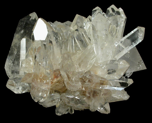 | Description: | Lustrous transparent colorless quartz crystals in a cluster fully crystallized on all sides. Ex. Bob Holzer (1934-2009) collection |
