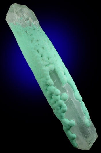 | Description: | Elongated selenite crystal, the transparent colorless variety of gypsum, with partial overgrowth of light-green chrysocolla. The termination has irregular faces, but appears to be complete and natural. Ex. Bob Holzer (1934-2009) collection |