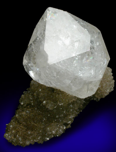 | Description: | Large single Herkimer Diamond crystal, the variety of transparent quartz crystals found in the Herkimer region of New York, on limestone coated with smaller quartz crystals that appear brown because the limestone color shows through from beneath. Collected by A. Wright in 1992 |