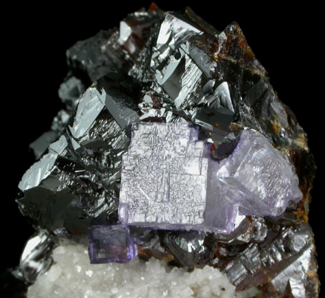 | Description: | Lustrous translucent brown sphalerite crystals to 10 mm with transparent cubic purple fluorite crystals to 7 mm. |