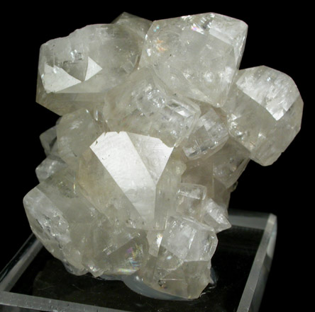 | Description: | Many lustrous transparent calcite crystals with pseudo-cubic form modified by rhombohedral corner faces. One crystal in the upper left has a contact from where it intersected another crystal. the calcite cluster is mounted to an acrylic display stand. Ex. W. Frech (1913-1998) |