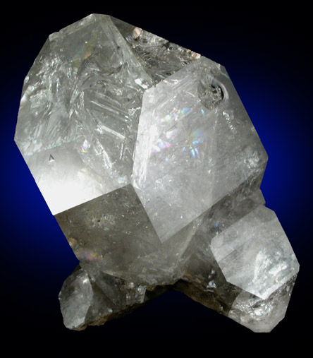 | Description: | Two parallel Herkimer Diamond crystals, the variety quartz crystals from the Herkimer region of New York, with several smaller crystals on the bottom where it was attached to matrix. The many internal fractures produce colorful rainbow interferences. Collected by A. Wright in 1995 |