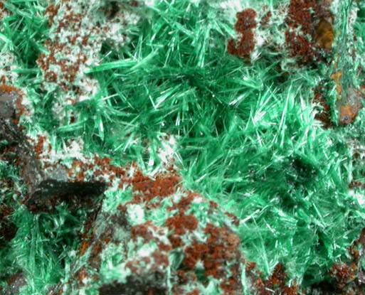 | Description: | Rich specimen of lustrous translucent acicular green brochantite crystals to 3 mm long on botryoidal black hematite microcrystals. Though the brochantite resembles malachite, testing confirmed the identification. |