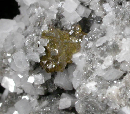 | Description: | Transparent yellow-brown sphalerite crystals in spherical rosette-shaped aggregates to 4 mm across plus translucent rhombohedral colorless dolomite crystals to 2 mm on limestone. The sphalerite crystals look beautiful when viewed under magnification. |