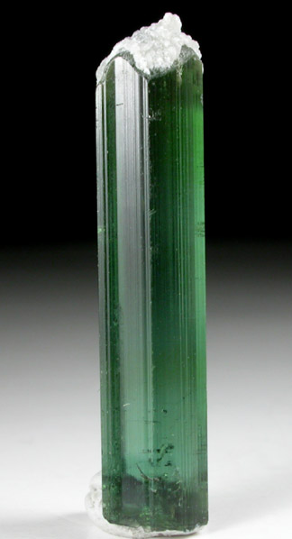 | Description: | Gem-grade green elbaite tourmaline crystal that is almost completely flawless throughout. The elbaite tourmaline has lustrous, striated prism faces and the termination is overgrown with pink-gray lepidolite mica crystals. Collected in 2006, pocket #13 |