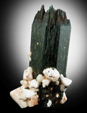 | Description: | Striated black aegirine crystal 31 mm high with complex termination that indicates the aegirine is actually a bundle of parallel crystals. Blocky white microcline feldspar crystals are included around the bottom end. |