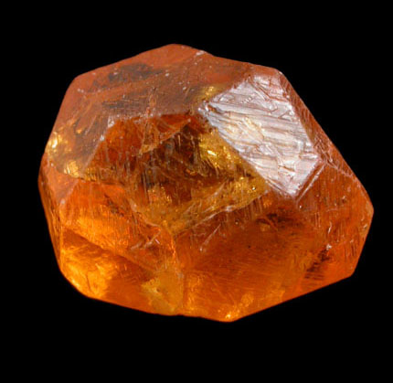 | Description: | Transparent-to-translucent orange spessartine garnet crystal with no matrix attached. The spessartine crystal is asymmetrical trapezohedral form and the crystal faces have complex crystallization patterns. |
