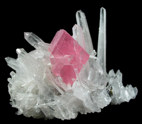 | Description: | Transparent pink rhombohedral rhodochrosite crystals to 8 mm with slender colorless transparent quartz crystals to 18 mm and brassy-metallic pyrite crystals to 3 mm. |