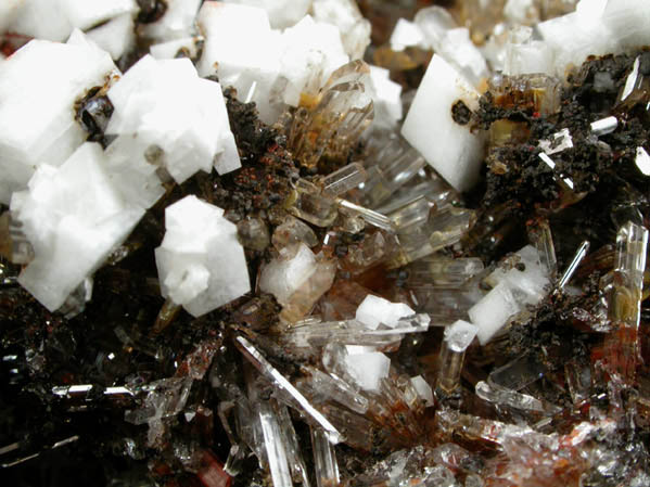 | Description: | Pristine lustrous white rhombohedral dolomite crystals to 8 mm across on transparent lustrous hemimorphite crystals to 7 mm with dark brown Fe-Mn-oxides throughout. |