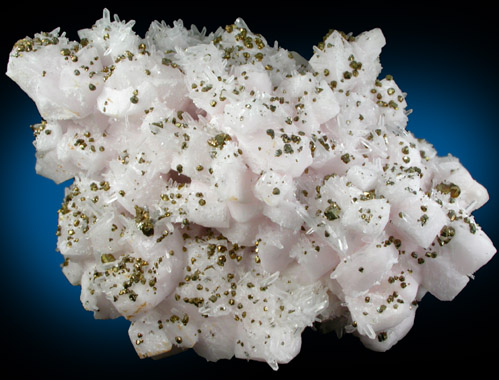 | AllMinerals/JohnBetts-FineMinerals > Online Mineral Museum Photographic Archive > Minerals from Peru > Calcite var. Manganocalcite with Chalcopyrite, Quartz |