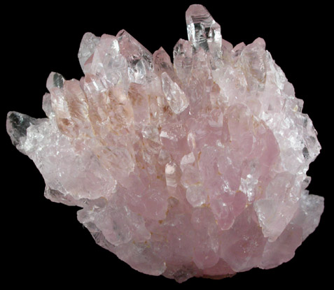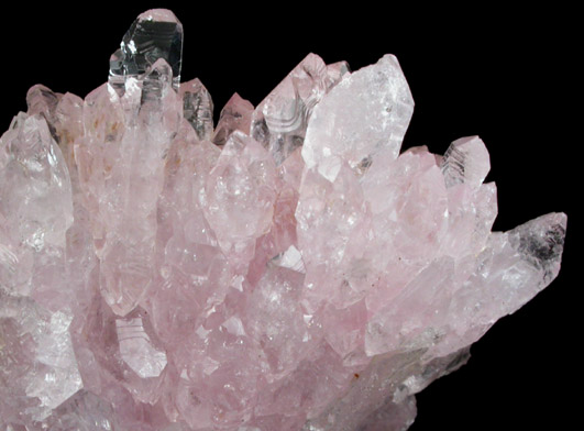 | Description: | Transparent-to-translucent pink rose quartz crystals with lustrous crystal faces fully crystallized all sides. Rose quartz crystals occur at only a few places throughout the world, notably from this locality below water level in the Jequitinhonha River. |
