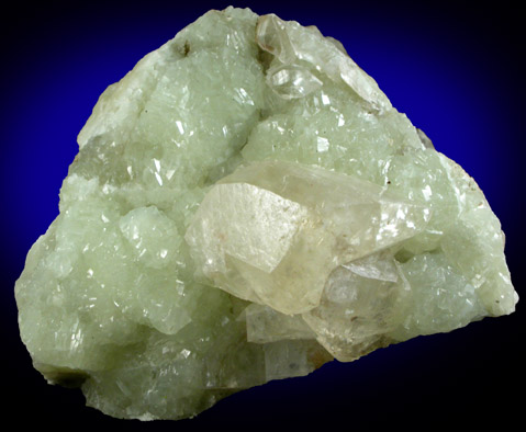 | Description: | Transparent yellow rhombohedral calcite crystal 30 mm across on translucent green prehnite crystals to 2 mm in rounded aggregates to 15 mm diameter. One face of the calcite is cleaved where the specimen was trimmed from surrounding rock. Ex. Joe Cilen (1916-1997) #3237, originally collected in 1939 |