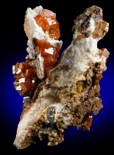 | Description: | Lustrous blocky orange wulfenite crystals to 8 mm covering many surfaces of convoluted formations of colorless calcite with select faces coated with brick-brown hematite-goethite. |