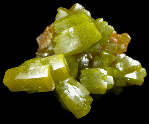| Description: | Lustrous translucent yellow-green hexagonal pyromorphite crystals over an earlier generation of As-rich orange pyromorphite. The larger pyromorphite crystals are slightly curved (arc-shaped). |