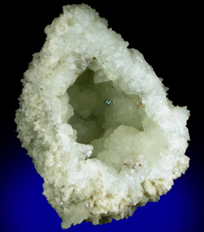 | Description: | Part of a hollow cavity composed completely of translucent pale-green datolite crystals to 10 mm with several iridescent striated metallic chalcopyrite crystals (identification based on morphology) deep inside the cavity. |