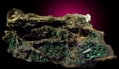 | Description: | Small needle-like crystals of dark green malachite on limonite matrix. ex. J. Cilen #17000 |
