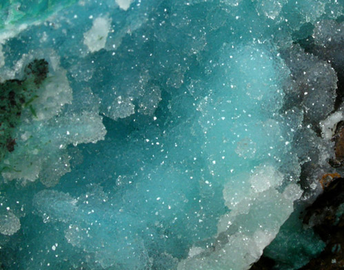 | Description: | Sparkling specimen of blue chrysocolla coated with transparent quartz microcrystals that are highly reflective. Looks beautiful under magnification. |