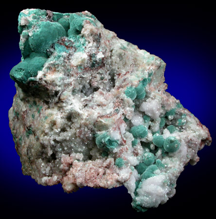 | Description: | Velvety green-blue rosasite crystals in spherical crystal aggregates to 8 mm diameter with sparkling colorless calcite microcrystals. Ex. Marshall Sussman |