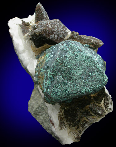 | Description: | Pseudo-octahedral metallic bornite crystal 16 mm across with gray patina and green microcrystal coating, possibly of malachite, on scalenohedral translucent calcite crystals to 11 mm with brown coating of bornite microcrystals. |
