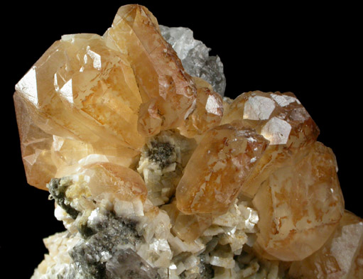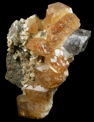 | Description: | Linear formation of translucent amber-colored calcite crystals to 20 mm on limestone with saddle-shaped white dolomite crystals to 3 mm and a partial quartz crystal on the rear. The calcite crystals flattened rhombohedral form and mostly transparent. |