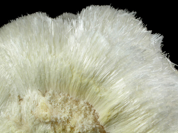 | Description: | Lustrous white fibrous natrolite crystals to 30 mm long over an earlier generation of yellow-white fibrous pectolite crystals with dull luster. |