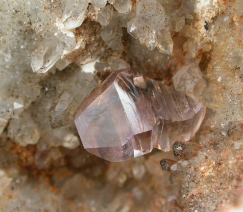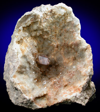 | Description: | Half of a hollow quartz geode with lustrous pale-purple amethyst quartz crystal 10 mm long nestled in the center surrounded by smaller colorless quartz crystals. |
