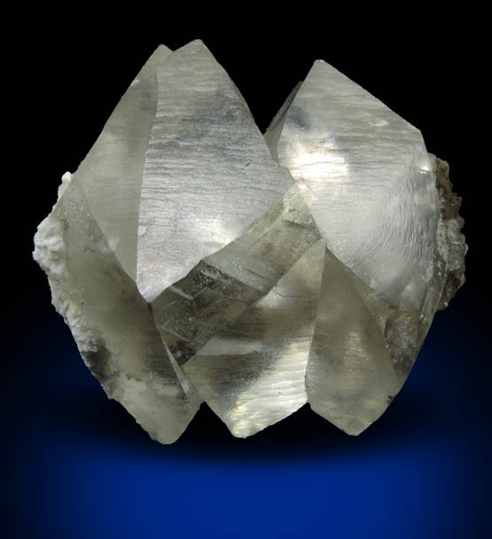 | Description: | Three interpenetrant-twinned rhombohedral calcite crystals with remnants of matrix on the bottom and ends. The calcite crystals are near-colorless, internally transparent, with silky surface luster. From my personal collection |