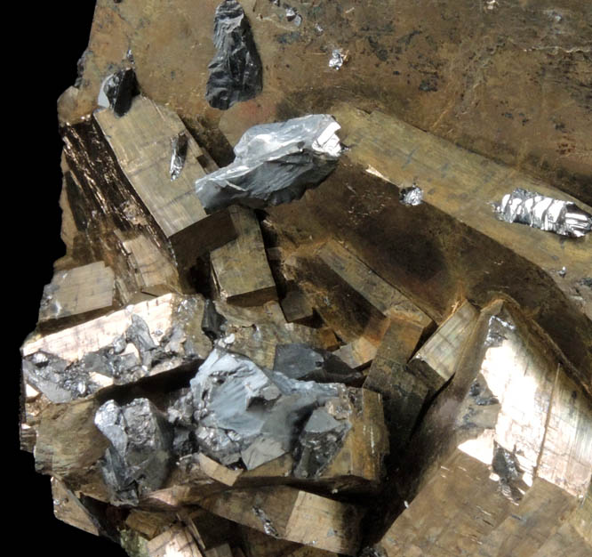| Description: | Tabular hexagonal bronze-colored metallic pyrrhotite crystals to 40 mm with lustrous black sphalerite crystals to 8 mm scattered throughout. The pyrrhotite crystals are complete around all sides and the specimen can be displayed from several angles. |