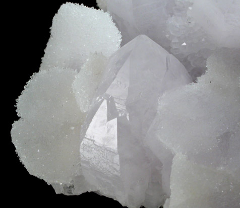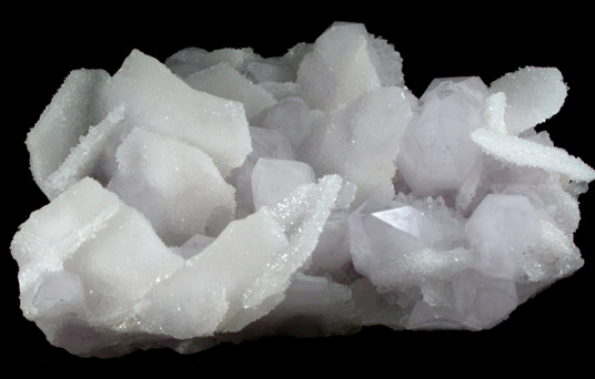 | Description: | Lustrous translucent pale-purple amethyst quartz crystals to 22 mm with sparkling colorless quartz pseudomorphs after butterfly-twinned flat calcite crystals to 18 mm. Thin calcite crystals formed first, then were coated with quartz microcrystals. |