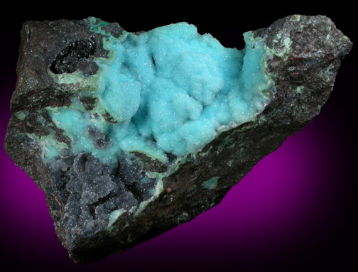 | Description: | Cavity lined with blue-green chrysocolla that is completely coated with transparent colorless quartz micro crystals. |