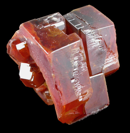 | Description: | Large translucent red hexagonal vanadinite crystals with remnants of tan-colored matrix on the bottom. The vanadinite crystals have lustrous prism faces with satin-like luster on the flat basal pinacoid termination faces. |