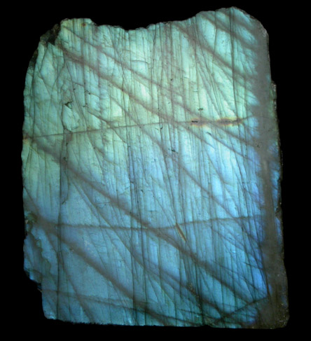 | Description: | Sawn slab of labradorite, the gem variety of anorthite feldspar, that exhibits bright Schiller-effect in many areas. The rear is rough with natural surfaces. Ex. Peter B. Nalle (1923-2010) collection |