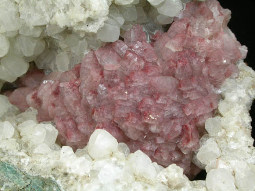 | Description: | Unusual pink-gray heulandite crystals to 5 mm in a hemispherical aggregate 32 mm across in a cavity lined with translucent colorless rhombohedral calcite crystals to 5 mm. The rear and bottom were sawn flat to remove excess bulk without risking damage. Ex. Albert J. Beres collection #212 |