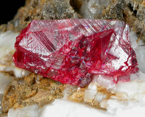 | AllMinerals/JohnBetts-FineMinerals > Online Mineral Museum Photographic Archive > Minerals from Nevada > Cinnabar (penetration twin) on Calcite |