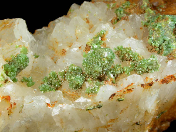 | Description: | Elongated portion of a vein lined with translucent white quartz crystals to 33 mm with translucent green pyromorphite crystals to 2.5 mm scattered over the quartz terminations and brown limonite stains throughout. Ex. Peter B. Nalle (1923-2010) collection |