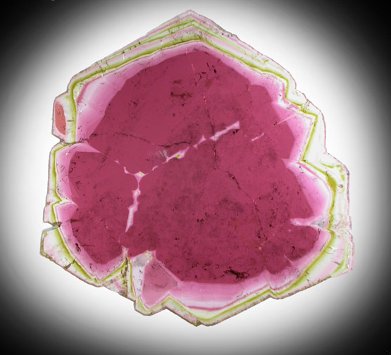 | Description: | Colorful slice from a liddicoatite crystal with front and rear faces polished to highlight the bright pink internal zone with thin green outer zones. The liddicoatite slice has a cloudy internal zone and complete outer edges that show striations. |