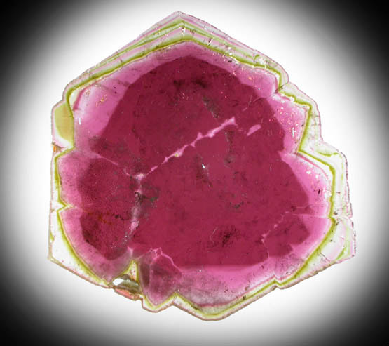 | Description: | Colorful slice from a liddicoatite crystal with front and rear faces polished to highlight the bright pink internal zone with thin green outer zones. The liddicoatite slice has a cloudy internal zone and complete outer edges that show striations. |