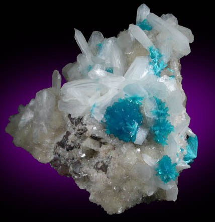 | Description: | Lustrous transparent blue bladed cavansite crystals to 6 mm in spherical aggregates of radiating crystals to 10 mm diameter on translucent white doubly-terminated stilbite crystals to 16 over smaller tan-colored transparent stilbite crystals to 2 mm. |