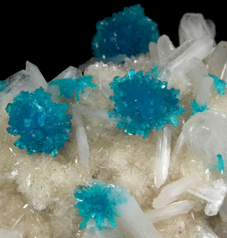 | Description: | Several spherical clusters to 10 mm diameter of transparent vivid-blue cavansite crystals on matrix coated with tan-colored stilbite crystals to 2 mm with a few larger translucent white doubly-terminated stilbite crystals to 18 mm. |