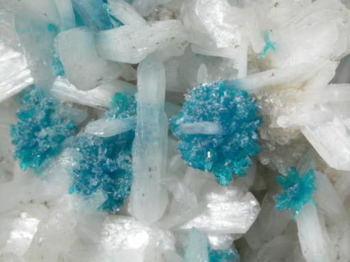 | Description: | Vivid blue transparent cavansite crystals to 5 mm in radiating spherical aggregates to 10 mm diameter on matrix coated with translucent white doubly-terminated stilbite crystals to 18 mm with smaller tan-colored stilbite crystals to 2 mm on the rear. |