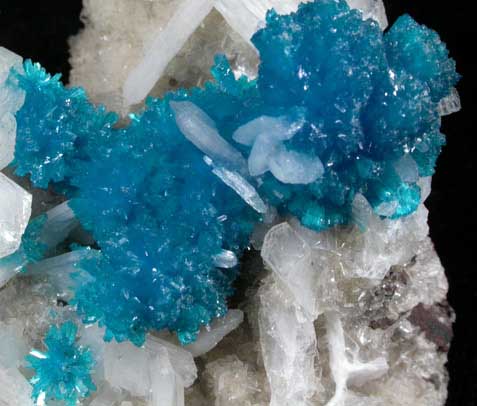 | Description: | Many vivid blue transparent cavansite crystals to 5 mm on matrix coated with small stilbite crystals overgrown with larger white stilbite crystals to 19 mm. Small colorless transparent stilbite crystals to 1 mm coat the cavansite. |