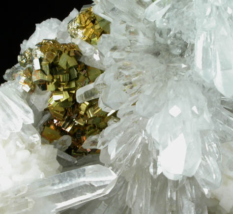 | Description: | Lustrous transparent colorless quartz crystals to 18 mm long with translucent white rhombohedral calcite crystals to 6 mm and yellow-metallic pyrite crystals to 6 mm. |