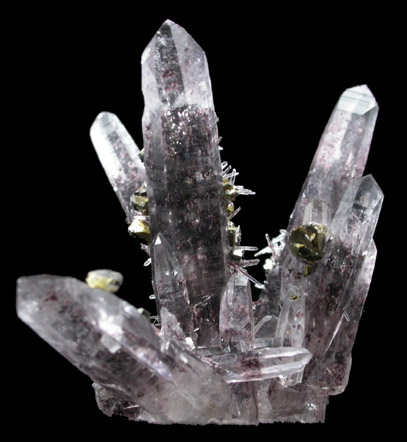 | Description: | Elongated transparent colorless quartz crystals to 22 mm long with red hematite inclusions that give the quartz a reddish amethyst-like color. Brassy metallic chalcopyrite crystals to 2 mm and small quartz crystals are overgrown on the larger quartz. |
