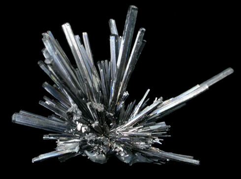 | Description: | Spray of gray-metallic stibnite crystals with no matrix attached. The stibnite crystals have a slightly dull luster. Most of the crystals have four-sided pyramidal terminations. Has remnants of glue on the bottom where it was attached to a base. |