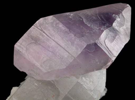 | Description: | Scepter formation of a larger amethyst crystal cap 25 mm long overgrown on a narrower stem of colorless quartz 32 mm long with minor white albite on the bottom where it was attached. |